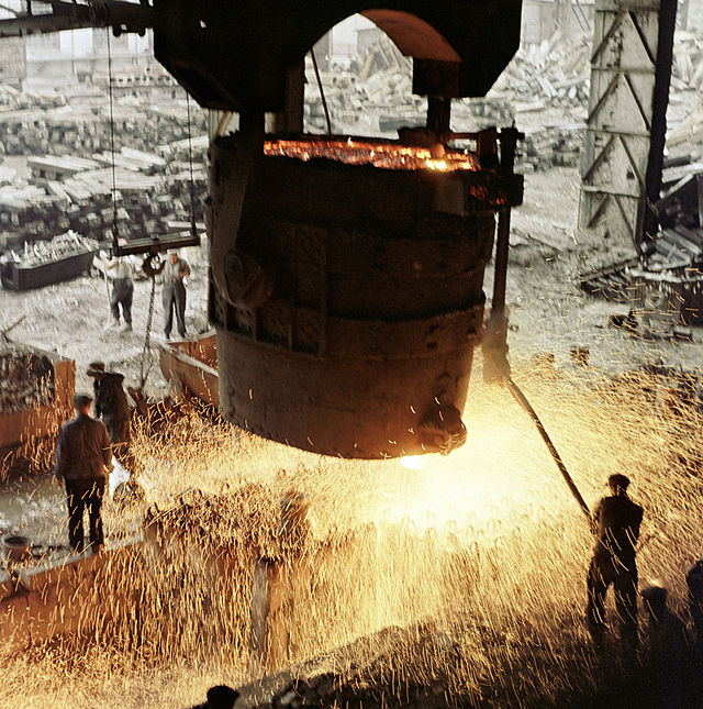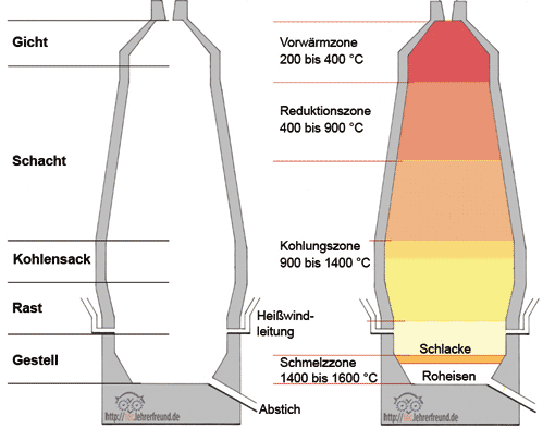 Erste Hochöfen entstanden 500 v. Chr. Bei Temperaturen von bis zu 1.600 °C wird in einer chemischen Reaktion aus der Eisenverbindung elementares Eisen gewonnen.