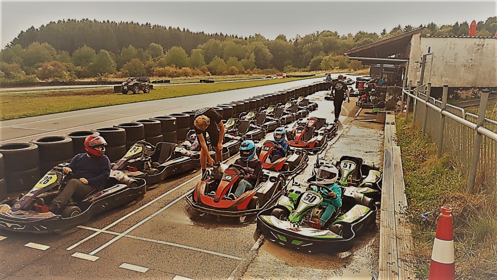 Aufstellung zum Go-Kart Rennen vor fast schon herbstlicher Eifel-Kulisse