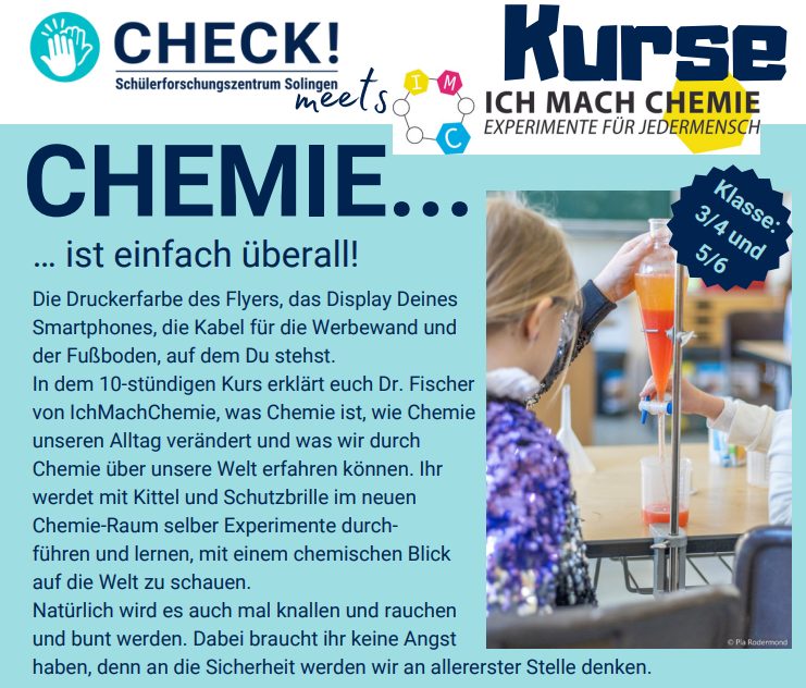 Nach Ostern wird das erste Chemie-Labor, das ich konzipiert habe, in Solingen eingeweiht: Check! Dieses ist Teil der Aktivitäten der Wirtschaftsförderung Solingen. Ab 26. April startet ein 10-stündiger Chemie-Kurs, jeweils Freitags nachmittags für Kinder der 3. bis 6. Klasse.